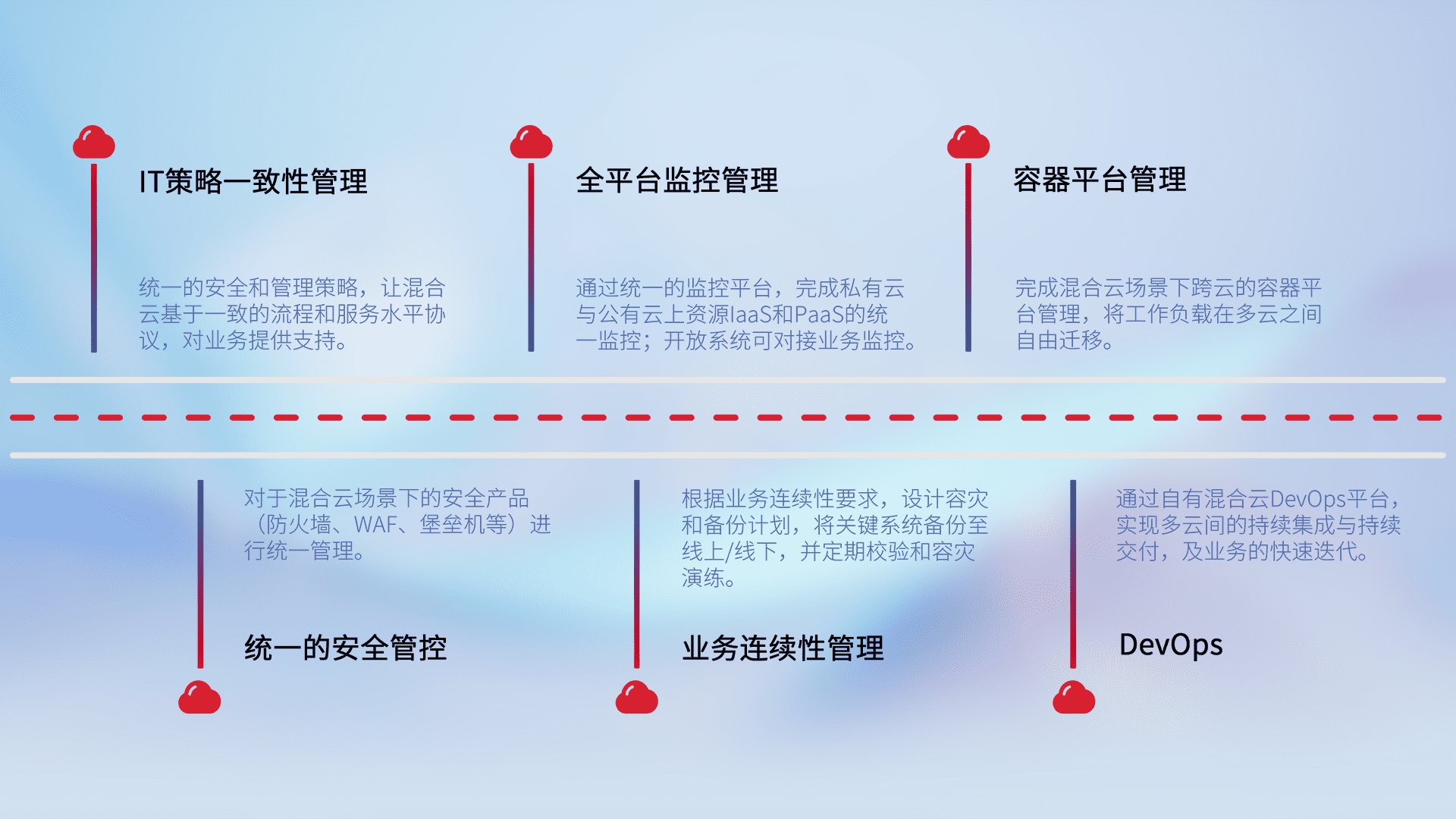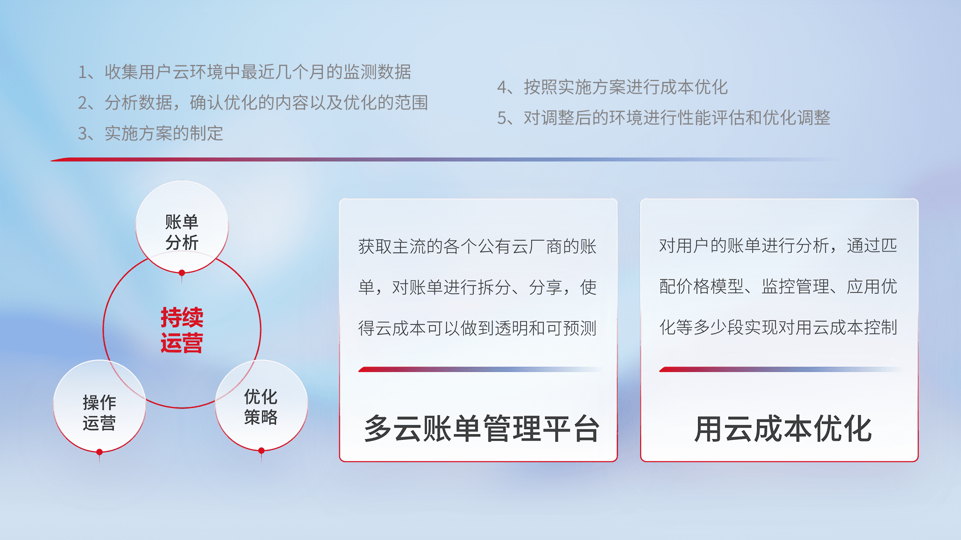 通过多云纳管,,,,以统一的资源数据模型把客户的云资源进行抽象和封装,,进而实现对多云资源的统一操作,,,保障云资源管理的可靠性、、、稳定性与可用性。。。。量身定制化运维内容,,,配置、、开发运维、、补丁管理、、、、备份、、、、监控、、、认证和访问管理、、审计和日常巡检等,,保障在用云过程中的可靠度,,稳定度以及高可用率。。